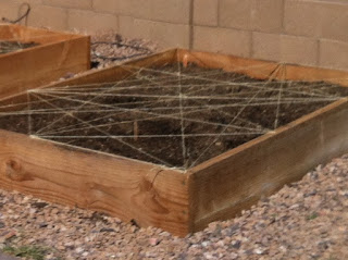 Apparently, the neighborhood cat likes cayenne pepper, because the solution did nothing to deter him. So I cleaned up the beds again, planted seeds again, and rigged up some kitty barriers. I hammered a few nails around of the wood beds (with help from the munchkin) and kept wrapping twine from nail to nail until the whole thing was covered like a big spider web. Actually, it looked pretty cool.